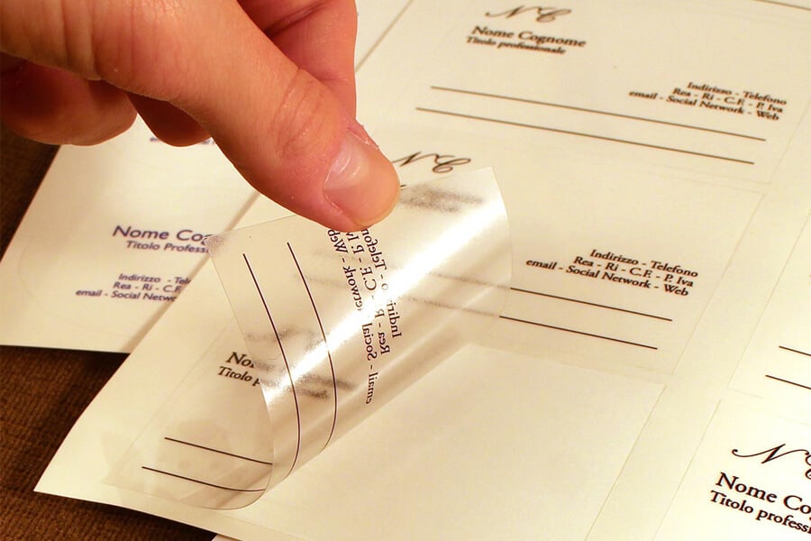 - Decal trong: Được làm từ nhựa PVC trong suốt thường dùng dán sản phẩm có bề mặt trong suốt như chai lọ ly cốc thủy tinh, nhựa trong, mica trong, bao bì túi bảo quản lạnh, vách cửa kính hoặc các bề mặt sáng màu khác. Có độ bám dính tốt và bền, chịu nước chịu nhiệt tốt, phù hợp dán bao bì thực phẩm đông lạnh, đồ ăn uống. Khi dán sẽ có cảm giác như in trực tiếp lên sản phẩm vì đường biên của tem không lộ. Nhược điểm là tem decal trong chỉ phù hợp in màu đậm, dán lên bề mặt sáng hoặc trong suốt (không nhìn rõ màu dán lên bề mặt tối nếu không in lót màu trắng).